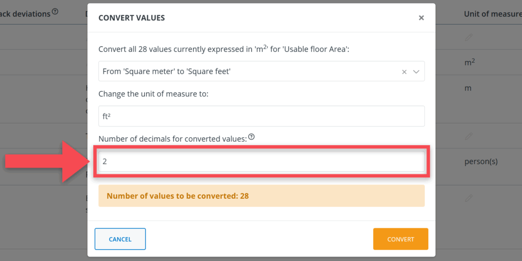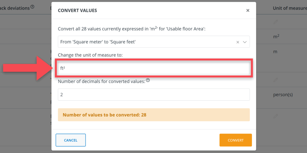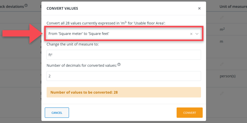BriefBuilder’s conversion feature allows you to change the unit of measure of a property and to recalculate the associated values automatically.