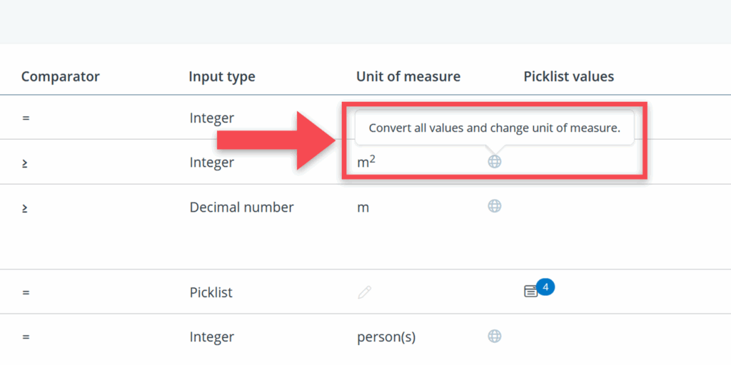 The conversion of units of measures can be done in the standard property settings for requirements, which can be found in the settings menu.