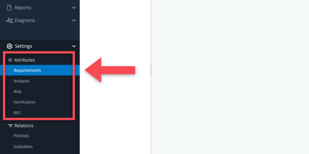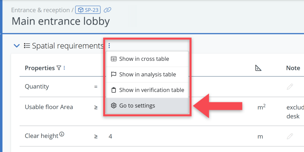 1) Go to the settings menu to find the relevant property (Settings > Attributes > Requirements), or go there by clicking on the settings icon in the More options menu, for the relevant table on an object’s detailview.