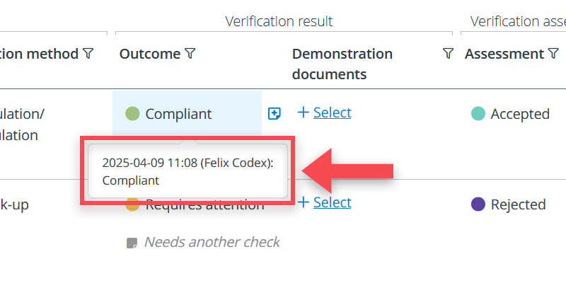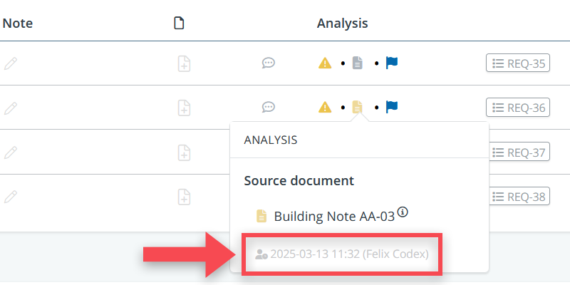 - Click on the analysis or verification next to a requirement to see the history data in the pop-up window.