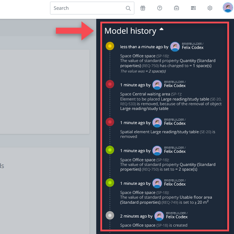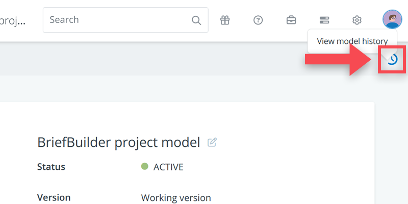 To view changes made to the requirements in a project model, you can click on the history icon on the project home: