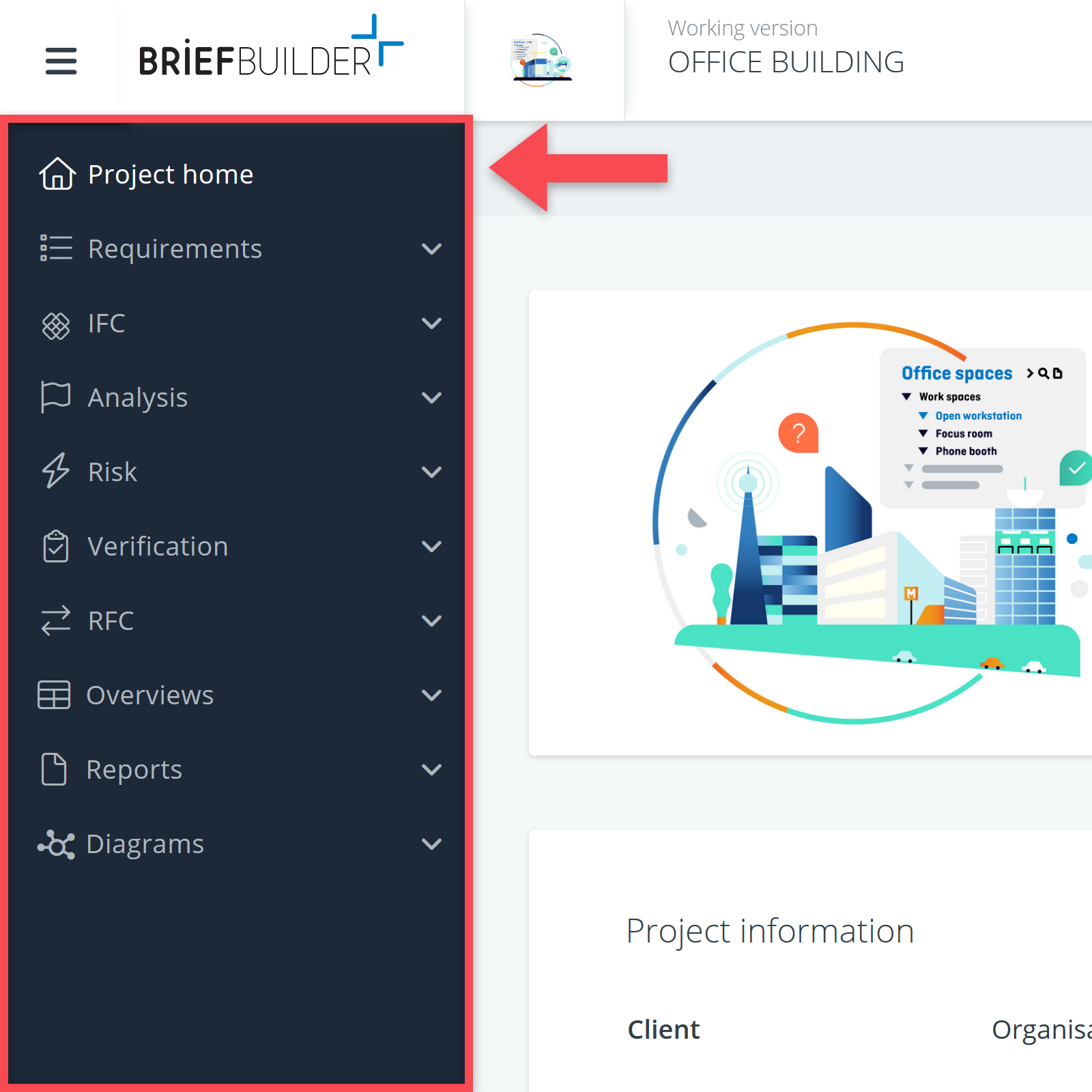 In your project model, there is a vertical menu bar on the left. This menu is the primary means of navigation in BriefBuilder.