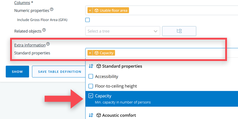 To do this, select any property from the picklist under extra information in the quantities table selection menu. This property will now be added as a column to your quantity overview.