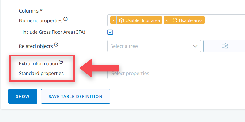 - For the table’s columns, you can select standard properties and/or related objects, depending on what kind of quantities you want to calculate in your table.