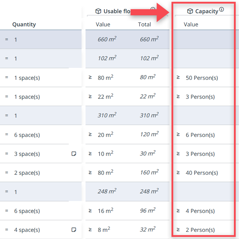 In the first two columns, you always see the spatial decomposition of your project (or a part of it) and the quantities of the spatial objects. These quantities will often concern spaces (as in the example below), but note that also groups of buildings may have a quantity.