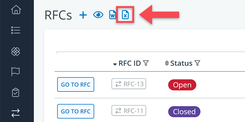In the RFC table (Navigation menu > RFC > RFC table), you can create an RFC by clicking on the icon that you can find right next to the table’s name.