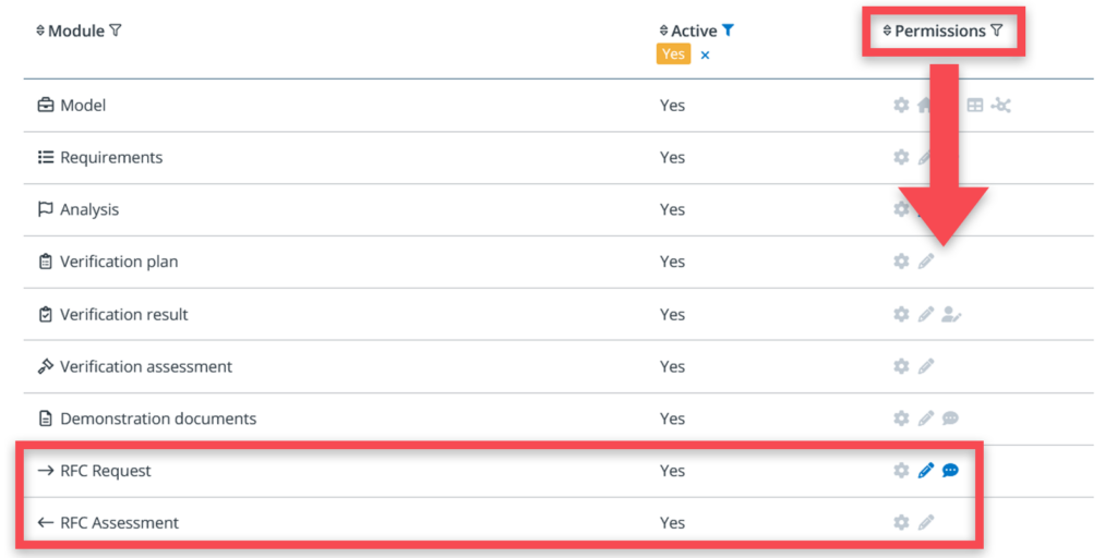 In the permissions overview, you can see two rows dedicated to RFC’s: RFC request and RFC assessment.