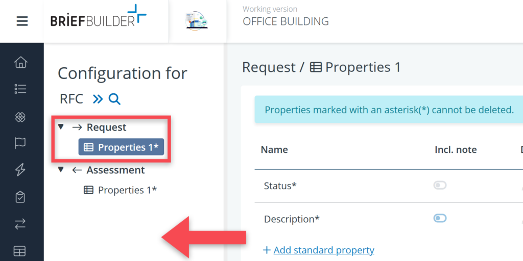 In the RFC settings tree you can select request or assessment. Selecting one of the two, or clicking on the small arrow next to the object types, will expand the settings tree. Below each object type you will see one or more property tables.