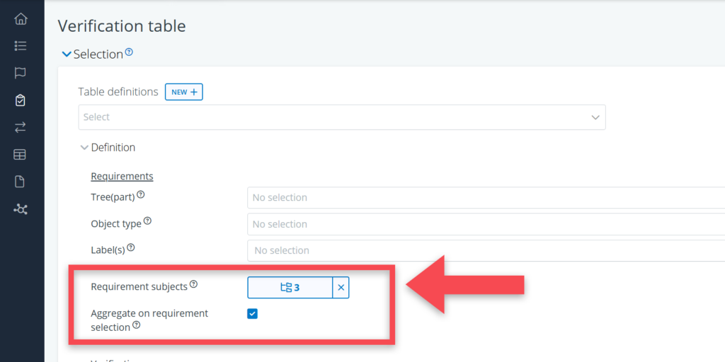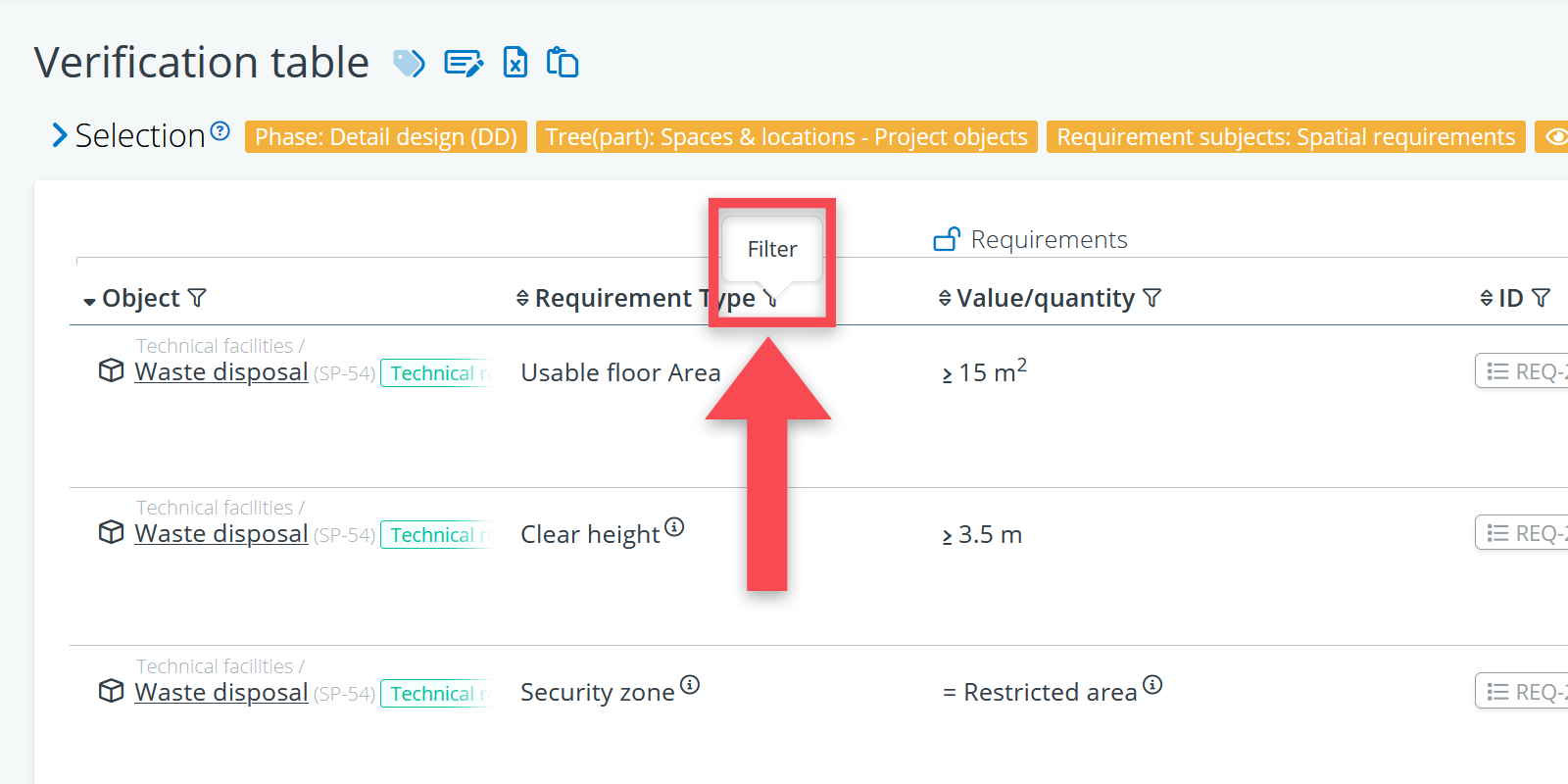 The verification table is a great tool if you want select a particular group of requirements that should all have the same plan or the same result. For example, all the requirements concerning room sizes, or all requirements concerning acoustics.