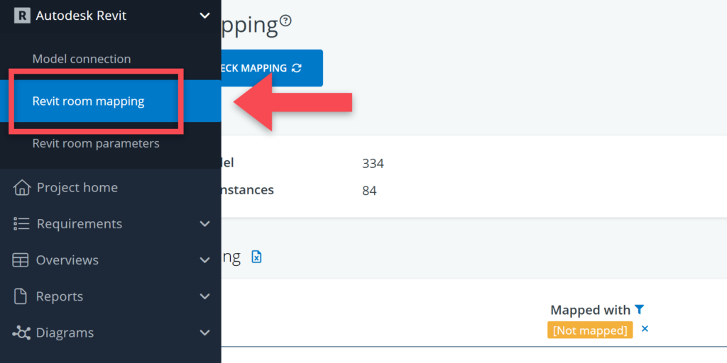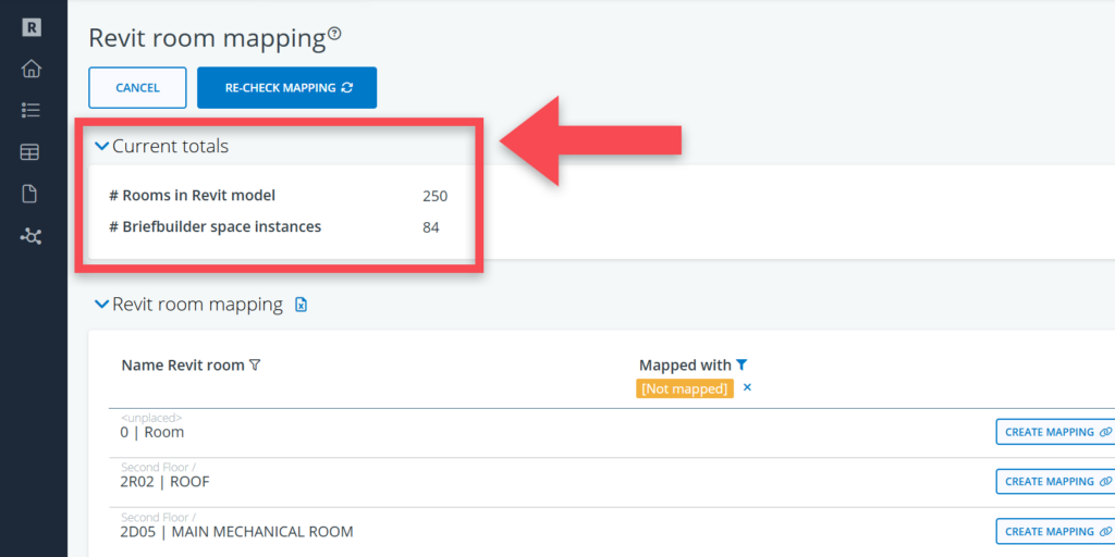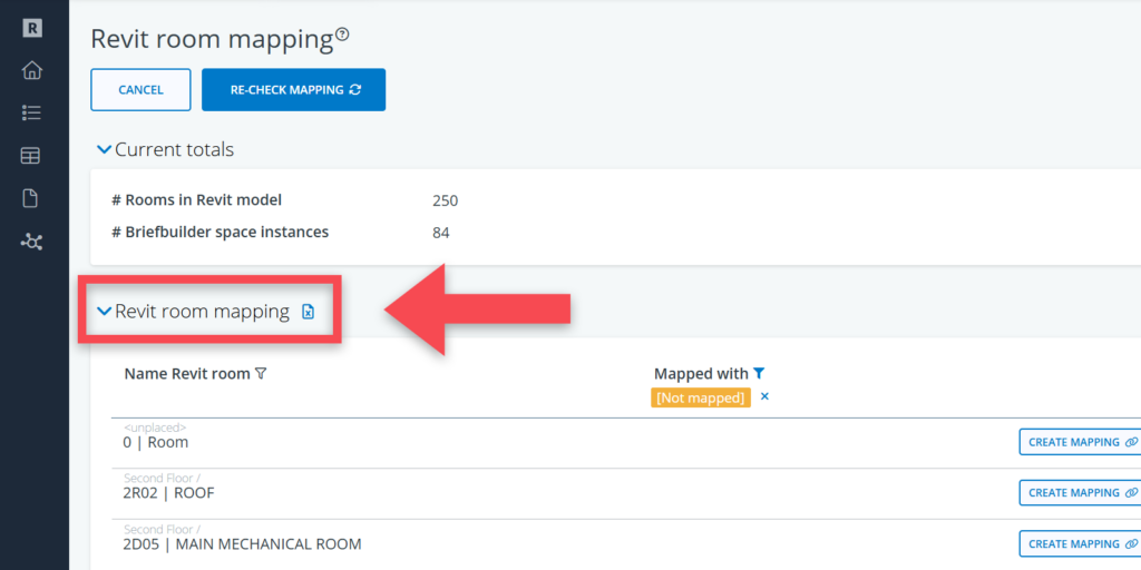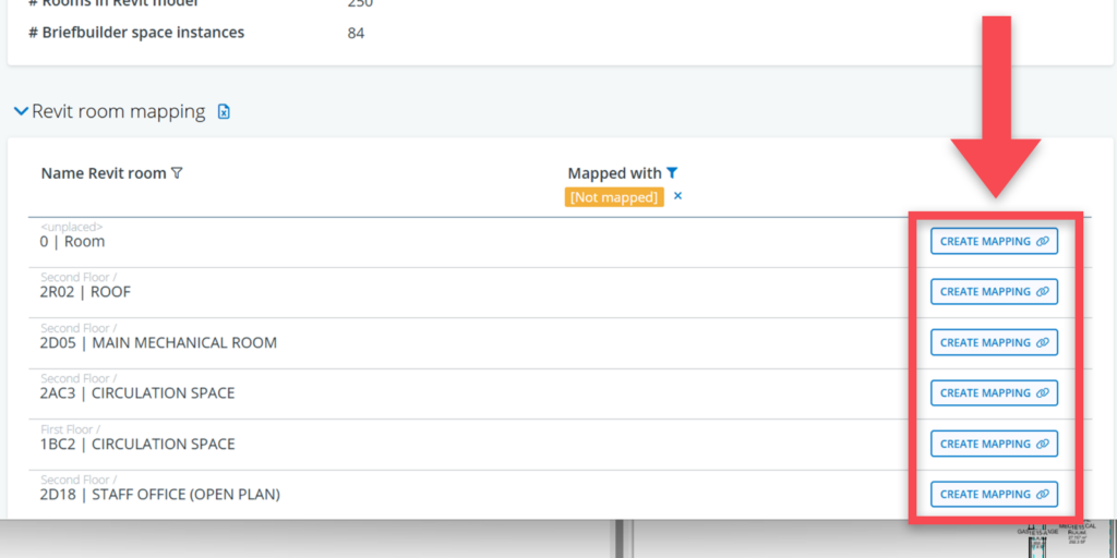 On the Revit room mapping page, you see the status and can manage the mapping between BriefBuilder spaces and Revit rooms.