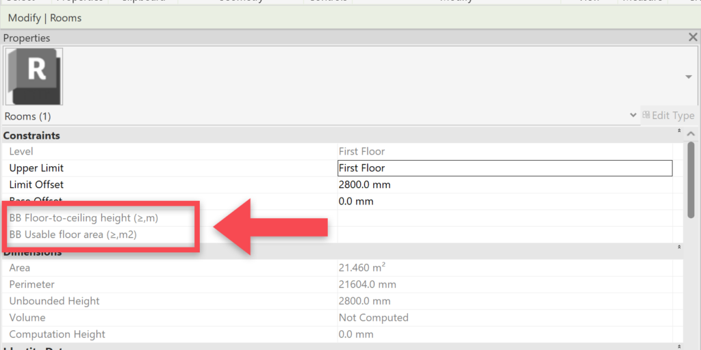 In Revit, the created parameters are for each room visible in the Constraints block.