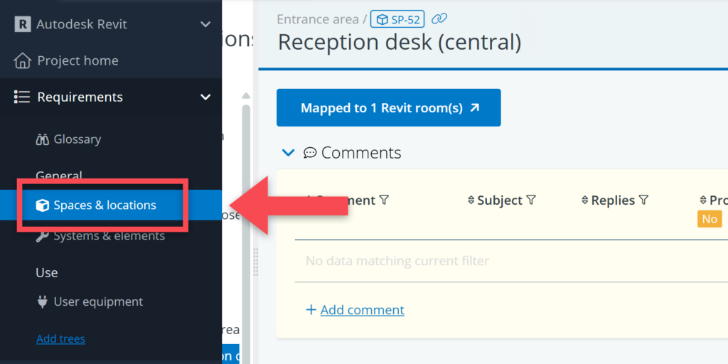 When navigating in the BriefBuilder list of spaces (Navigation menu > Requirements > Spaces & locations) in the add-in, you can also find a link to related Revit data via the detail view of a space.