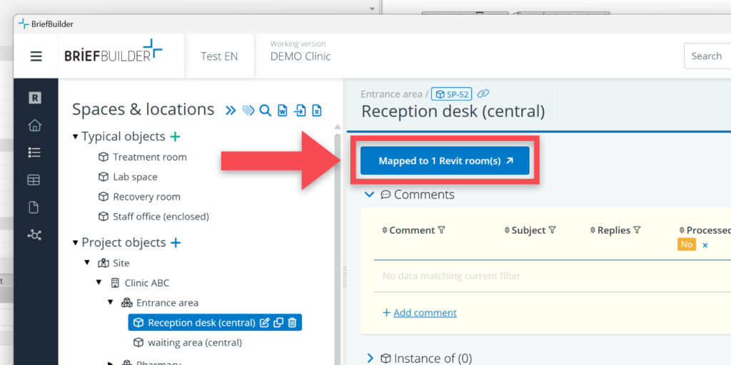 If you then move to the add-in, you can either create a mapping (if a room isn’t mapped) or see the relevant space in BriefBuilder (in case there is mapping).