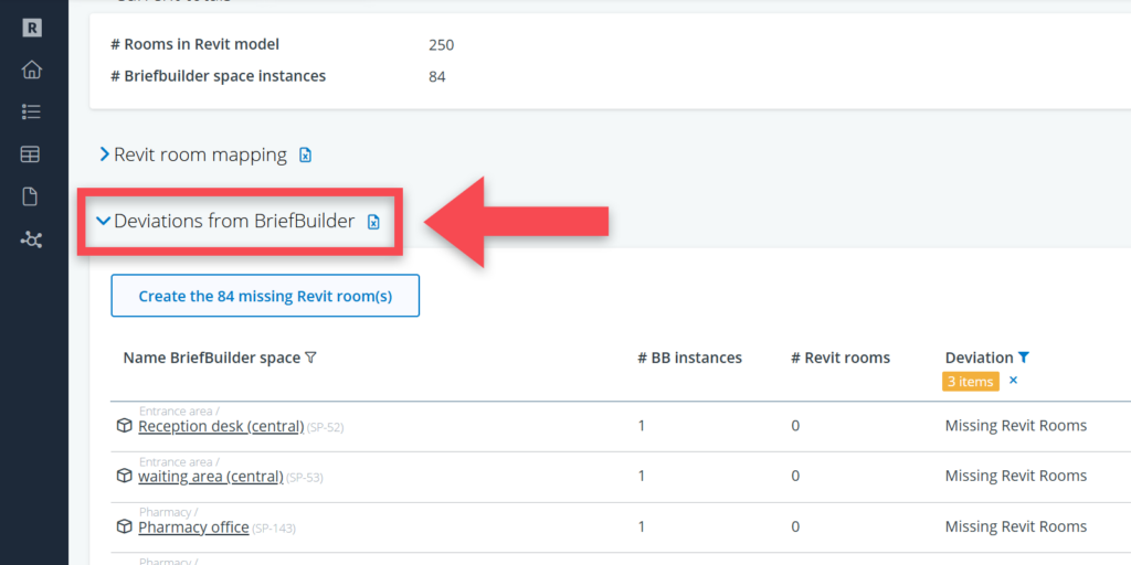 This section basically shows the same data as the section above, but from the perspective of the BriefBuilder spaces, including the deviation between the requested number of spaces and the designed number of Revit rooms.