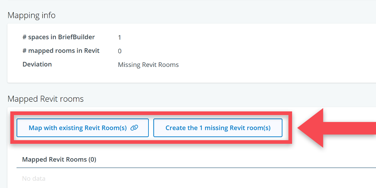 The button shows whether the space is mapped with any Revit rooms or not. Clicking on the button will bring you to a mapping page for that specific BriefBuilder space. This page works similar to the deviation popup of the Revit Room mapping page.