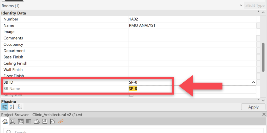 When selecting a room in Revit, you can check whether it has been mapped by looking at the parameter BB ID in the Identity Data section. If that field features a BriefBuilder object-ID (SP- …). it has been mapped with a BriefBuilder space.