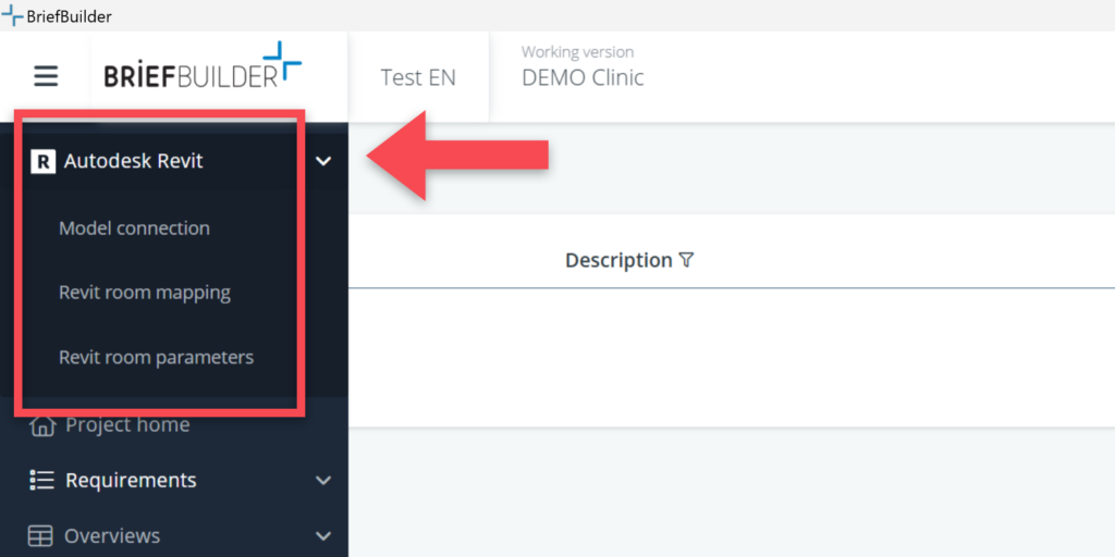 You will notice that the add-in’s user interface is very similar to the one you see when logging into BriefBuilder via a browser. The main difference is that there is an additional menu item at the top of the navigation bar, named Autodesk Revit.