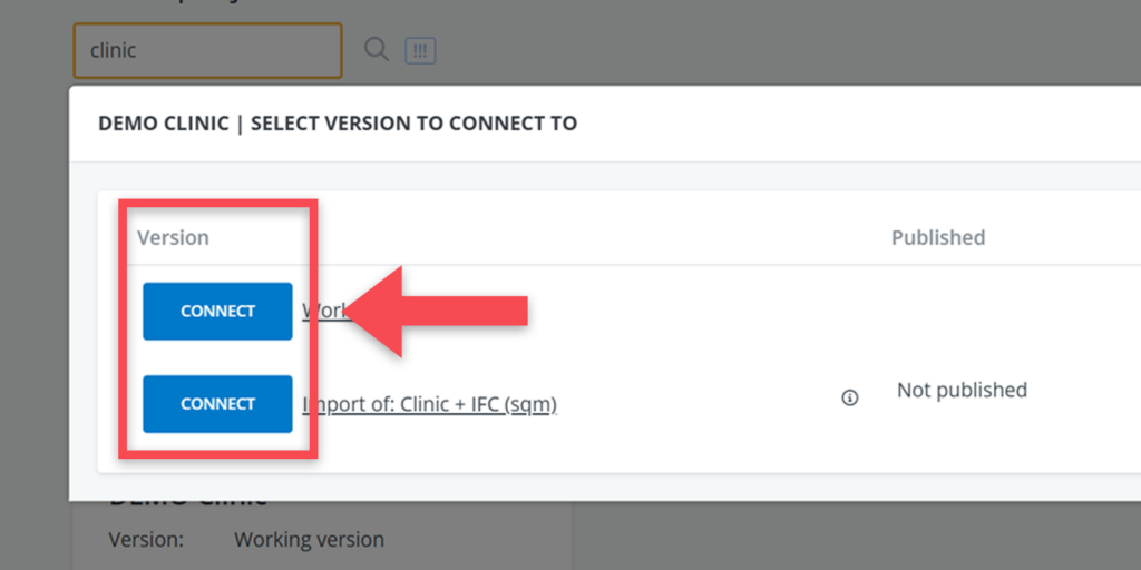 In BriefBuilder, you’ll see the project model(s) to which you have access. You have to click on the relevant project ’tile’ and then select the version of the model that you want to connect to.