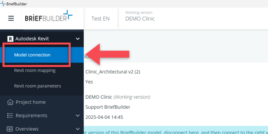 As explained earlier in this article, you need to connect the Revit model to a BriefBuilder model and a specific version of that BriefBuilder model. In this part of the menu you can find information about to which model, and which version, you are currently connected.