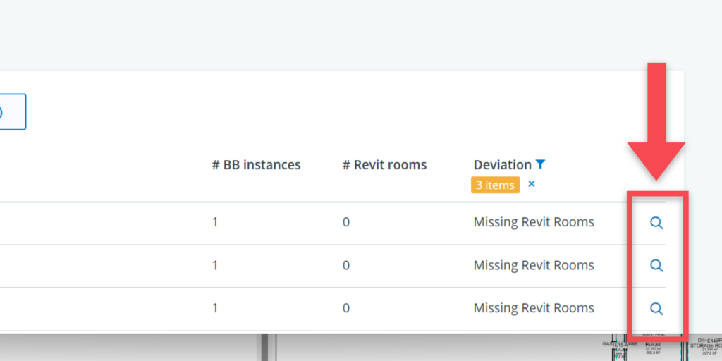 To see and manage the mapped Revit Rooms for a BriefBuilder space, you can click on the magnifying glass icon at the end of the row ().