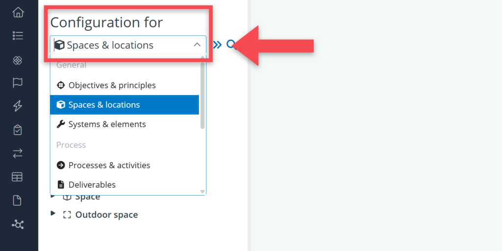 The standard properties can be defined per object type (space, location, system, …). These can found by selecting the relevant model tree (Spaces & locations, Systems & elements, etc.) in the Configuration for field (see screenshot below).