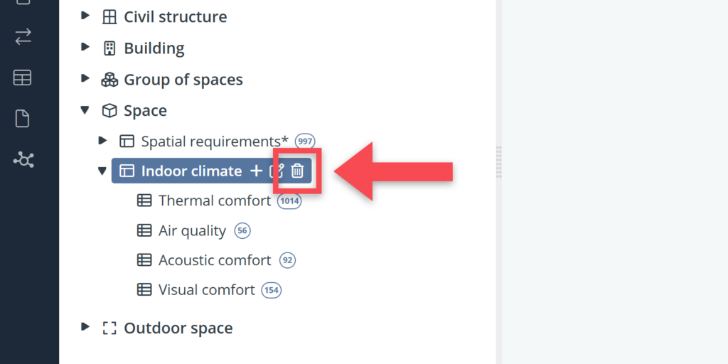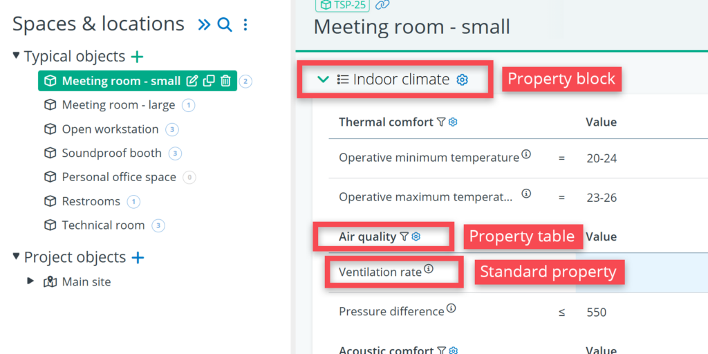 As explained in the theory section, objects in BriefBuilder (spaces, systems, processes etc.) can have particular properties (e.g. size, capacity or width). You can create these properties as object-specific properties on the detail view of an object, but you can also predefine them as standard properties in the requirements settings menu.