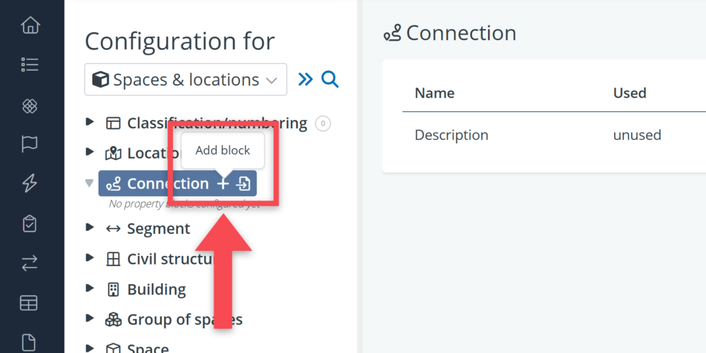 To create and configure standard properties, you have to start by creating a block. You create a block by selecting an object type and clicking on the + Add block button next to its name.