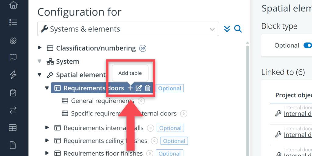 When not checking this box, the block will be non-optional, meaning that it will automatically be linked to all objects of that particular type. This is relevant when a block contains properties that are relevant to all objects of the same type, e.g. a block with spatial requirements that are relevant for all spaces.