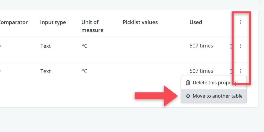 Standard properties can be moved to another table within the same block. To do this, click on the icon next to the property, select Move to another table, and choose the target table from the dropdown list in the pop-up.