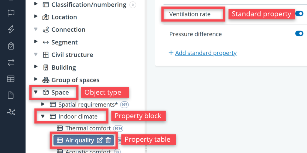 You may, for example, want to predefine that spaces should have a property Minimum floor-to-ceiling height, that technical systems should have a property Warranty or that deliverables should have a property Submission moment.
