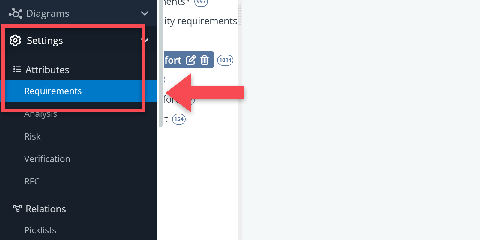 Standard properties can be defined in the requirements part of attributes settings, which can be found at the bottom of the navigation menu.