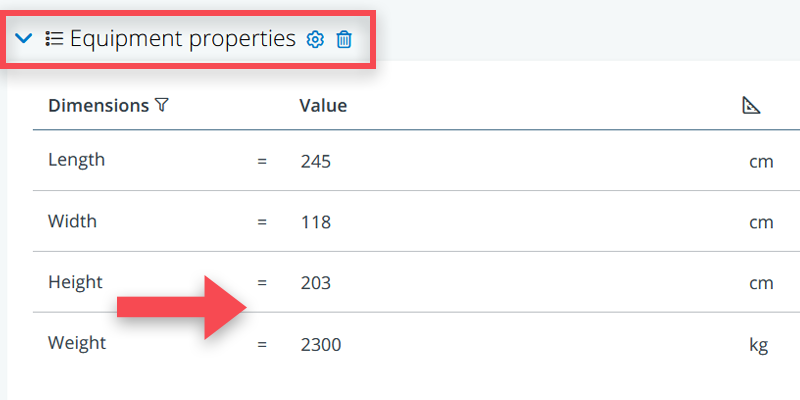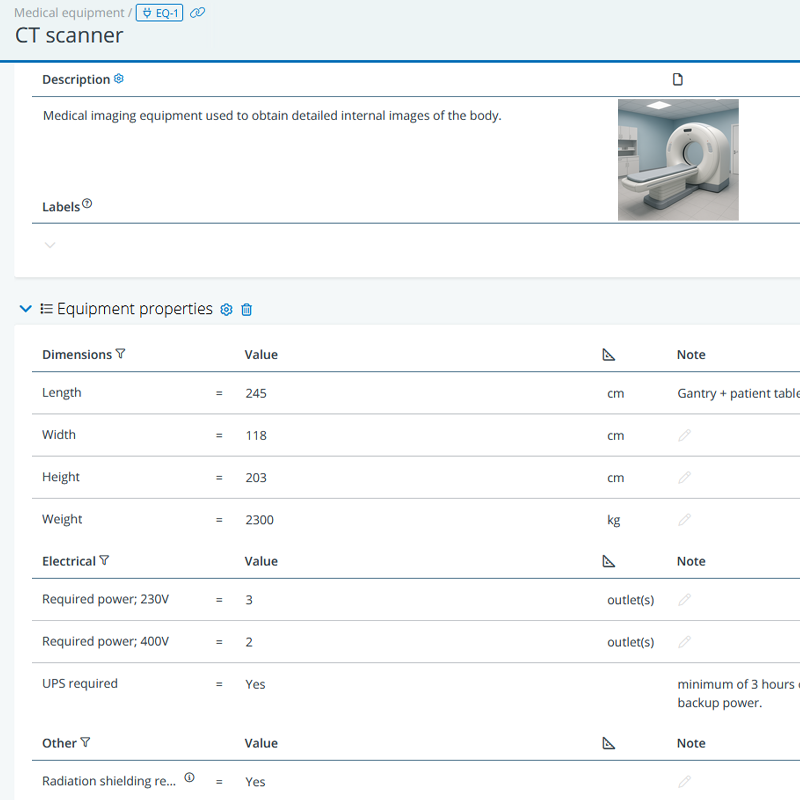 Most important in describing the equipment items are, typically, their properties. Think of properties such as power need (relevant to define the number of power outlets in a room), weight (relevant for floor loads), dimensions (relevant for room heights and the size of door openings), sound production (relevant for sound insulation) and other specifics.
