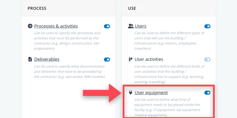 With the module active you can navigate to the user equipment tree, located under requirements > use > user equipment in the navigation menu on the left.
