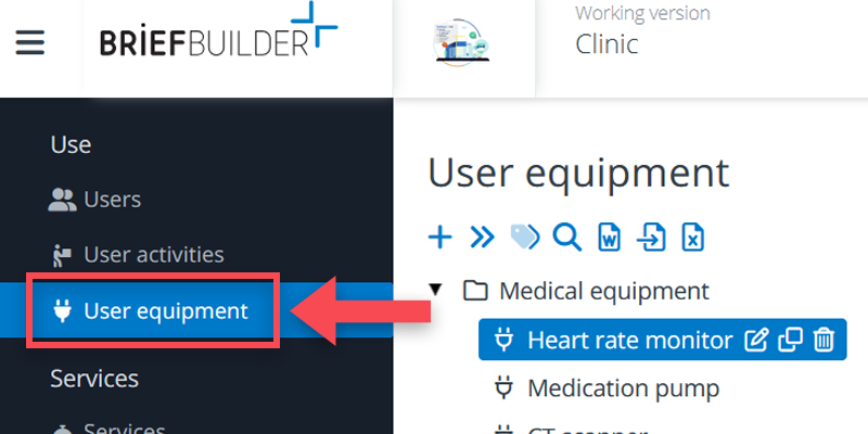 The user equipment tree in BriefBuilder is a module that is not active by default when starting a new project. To activate it, you have to go to the modules part of the settings menu (as explained in this article).