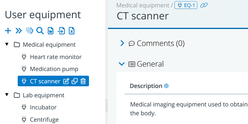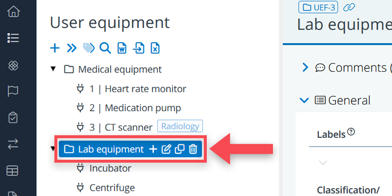 The user equipment objects represent the actual equipment items (or equipment types), and the folders can be used to organize your tree structure. You may, for example, want to group your equipment items according to their functionality, distinguishing between IT-equipment, medical equipment, lab, equipment and so on.