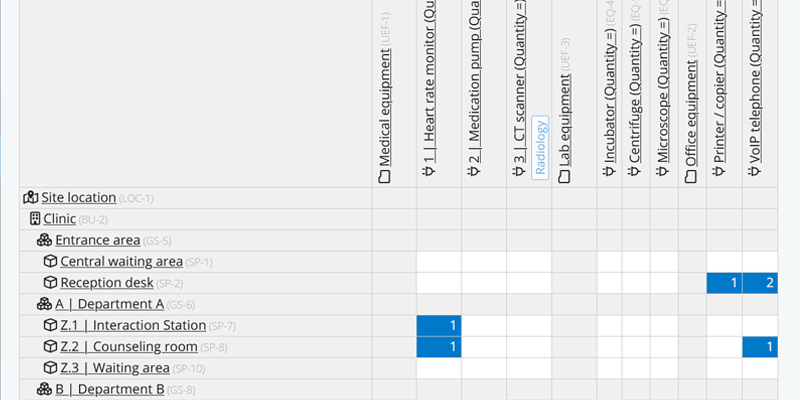 This overview doesn’t calculate whether you have under- or over specified the number of power sockets, but it gives the electrical engineer a clear overview of what is asked for and what has been specified. For example: the cross table indicates that there are two equipment items in the CT Imaging Suite: a heart rate monitor that requires two 230V power outlets. And a CT scanner that requires four 230V power outlets. Which is in line with the specified number of power sockets for that space (the dark blue cells in this case).