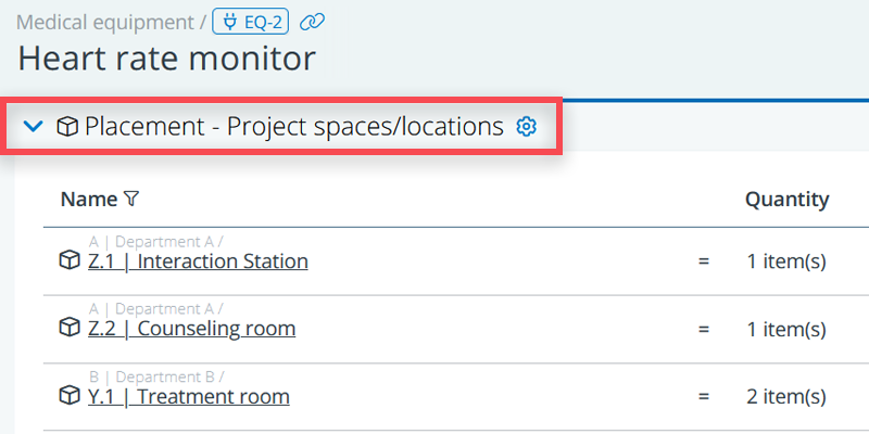 When you have defined your equipment, you can create relations with the spaces where they need to be placed. It allows for a clear overview of what is expected to be placed where. Creating these relations ensures that requirements driven by equipment are captured.