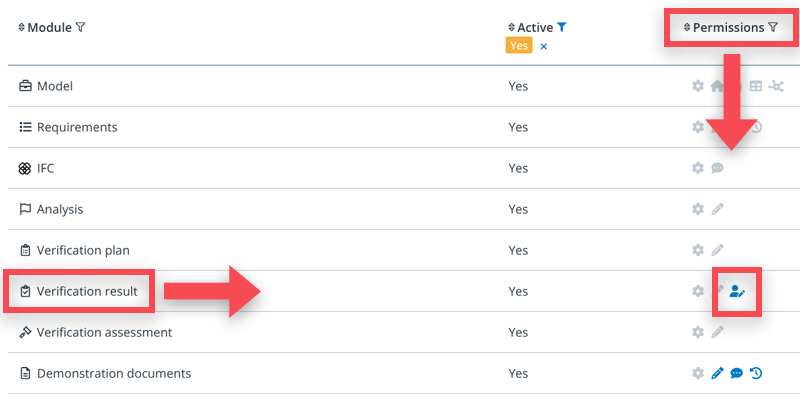 Each of these modules comes with a set of permissions, signified by the small icons in the table. When a permission is activated, the icon is blue. If not, it is grey. See below for an explanation of each icon.