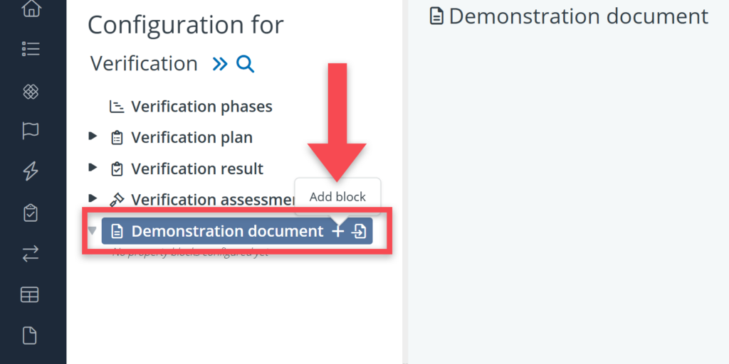 1) Click on demonstration document in the settings tree and click on the plus-icon (Add block)