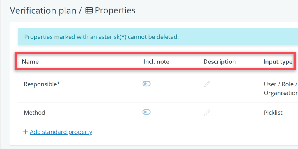 - Input type: define what kind of values should be possible. For verification properties, it is usually the picklist that is relevant (e.g. when you want to define a list of methods) or the user/role /organisationoption (when you want to create a property for assigning responsibilities).