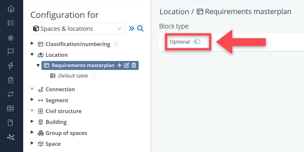 When you have an optional block that you want to turn into a non-optional block (= a block that is automatically linked to all objects of that type, e.g. all spaces, all elements, etc.), you can do this in the settings: